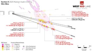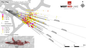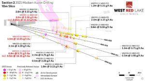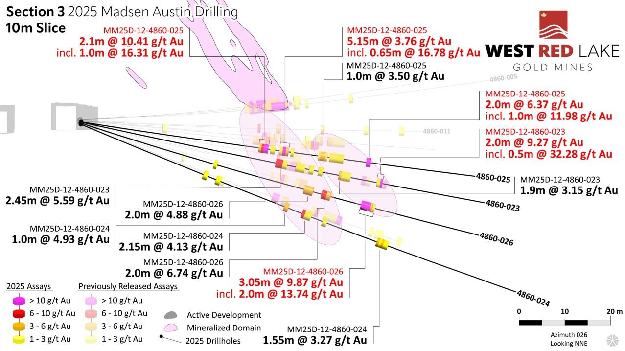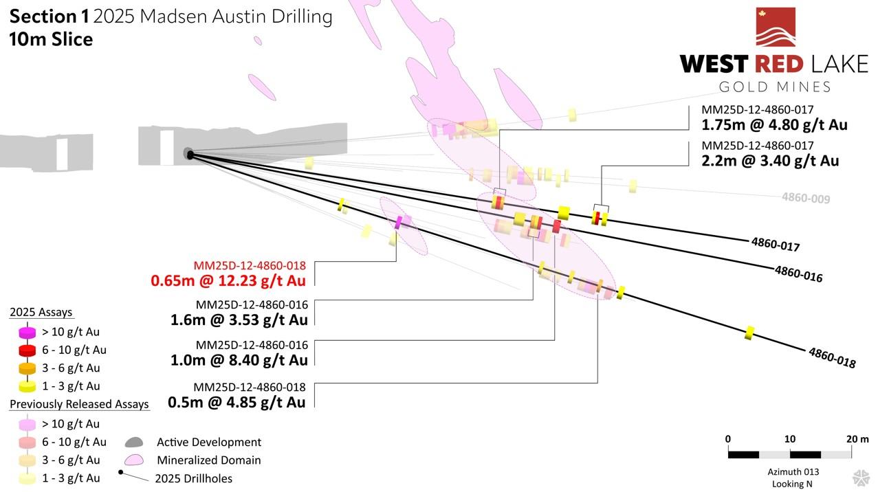 These results from the 12-4860 drill station are in addition to the Lower Austin intercepts recently announced on October 9, 2025 which highlighted 139.45 g/t Au over 7.8 metres,74.70 g/t Au over 8.7m and 18.31 g/t Au over 7.5m; and on April 1, 2025 which highlighted 23.81 g/t Au over 5.4m, 30.16 g/t Au over 4.3m and 12.43 g/t Au over 10.5m. The 12-4860 station is located on 12 Level in the Madsen Mine at approximately 600m depth. Recent drilling from this area demonstrates the potential for discovery of additional high-grade lenses of gold mineralization in the main Austin Zone very similar to those that have already been delineated in the South Austin zone during 2025 (see press releases dated August 12, 2025, May 27, 2025 and February 26, 2025). The lower Austin area will continue to be a key focus of drilling for the remainder of 2025.