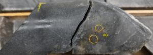 *The “From-To” intervals in Table 1 are denoting overall downhole length of the intercept. True thickness has not been calculated for these intercepts but is expected to be ≥ 70% of downhole thickness based on intercept angles observed in the drill core. Internal dilution for composite intervals does not exceed 1m for samples grading <0.1 g/t Au. The “VG” column indicates the presence of Visible Gold as observed by the core logging geologist. The (hw) and (fw) notes under “Domain” column are indicating position of grade intercept “hangingwall” or “footwall”, respectively, to primary vein domain. Vein intercepts currently defined as “Unmodeled” may be incorporated into new vein domains in upcoming MRE update for Rowan.
