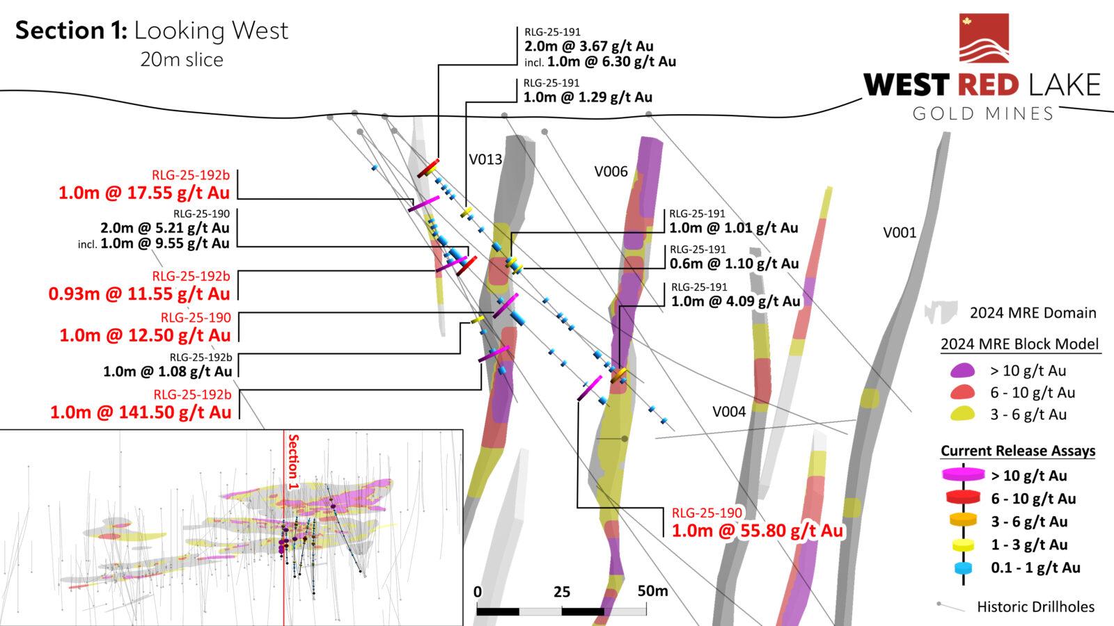 FIGURE 5. Rowan drill section showing assay highlights for Holes RLG-25-190, -191 and -192b.