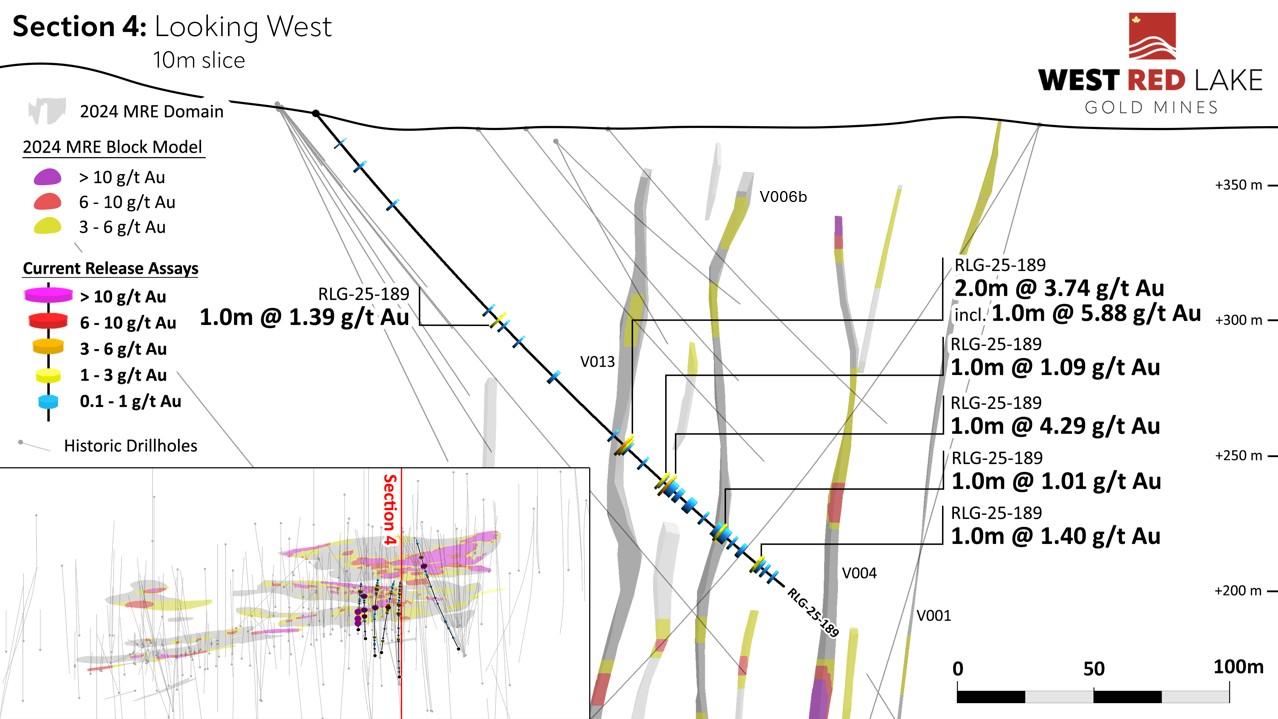 FIGURE 8. Rowan drill section showing assay highlights for Hole RLG-25-189.