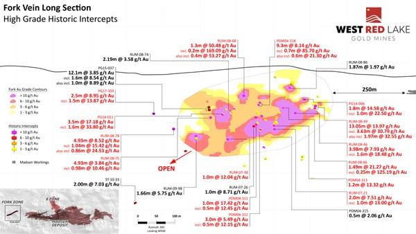 FIGURE 4. Fork Vein Long Section Showing High-Grade Historic Intercepts from Drilling Completed Between 2004 and 2017. Existing underground development at Madsen shown along right margin of the figure approximately 250 m from the Fork resource.