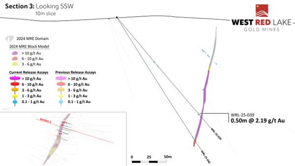 FIGURE 8: Fork drill section showing assay highlights for Holes WRL-25-039 and -040.