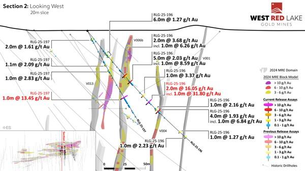 FIGURE 7. Rowan drill section showing assay highlights for Hole RLG-25-196 and -197[1].